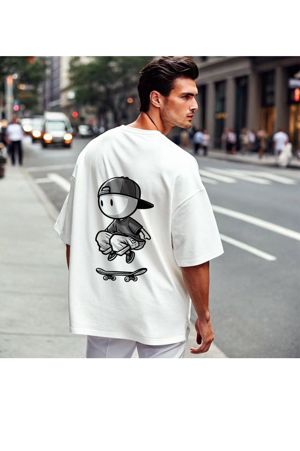 - Back: Cartoon skater graphic with cap & board