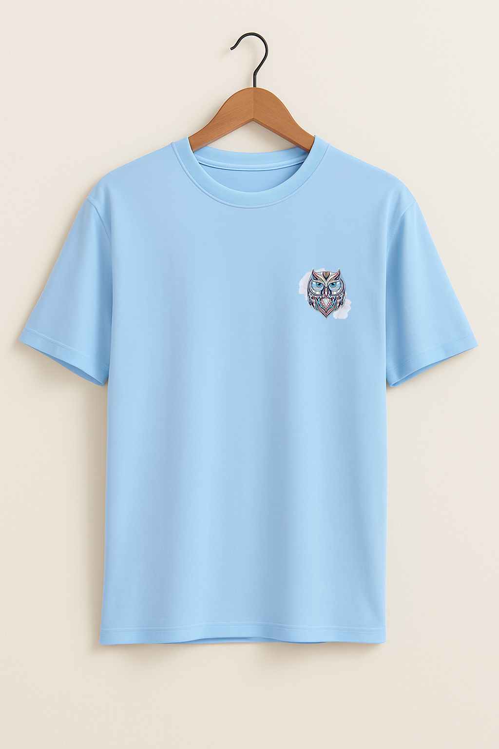 Unleash your inner wisdom and style with the Mystic Owl – Sky Blue Edition T-shirt. Featuring a stunning mandala-style owl illustration printed on both the front pocket area and back, this tee blends vibrant art with calm elegance.